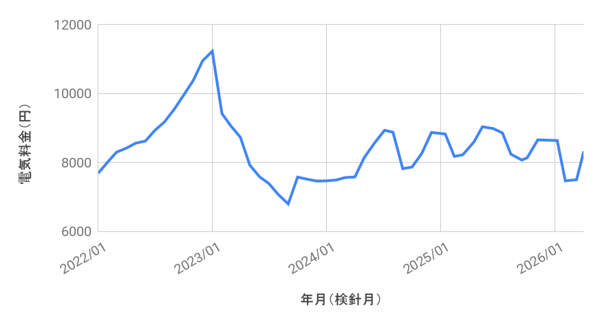 2026年2月検針(1月使用分)以降、「電気・ガス料金支援」の補助金再開により、電気料金は値下がりが続いていましたが、平均燃料価格の値上がりを受けて2026年3月検針(2月使用分)から値上がり傾向に。さらに2026年4月検針(3月使用分)での電気代は、前月と比べて822円値上がりしています。